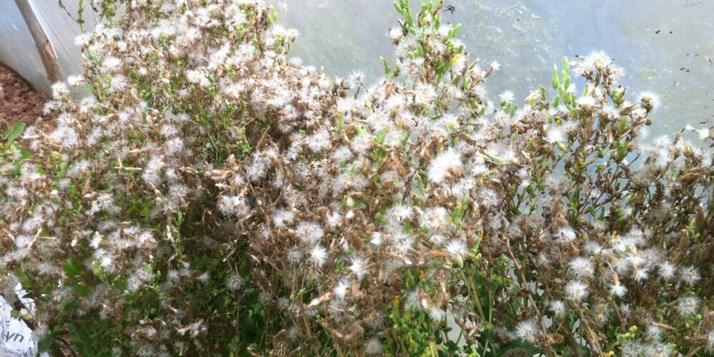 Keep an eye on the ripening seed heads and when you can see the seeds inside it is time to harvest. I like to pinch off the seed heads, rub the seeds out and collect them in a shallow dish. I then gently blow off the chaff and put the dry seeds in an airtight jar in the fridge. If kept cool and dry, lettuce seed will keep for ten or more years.
